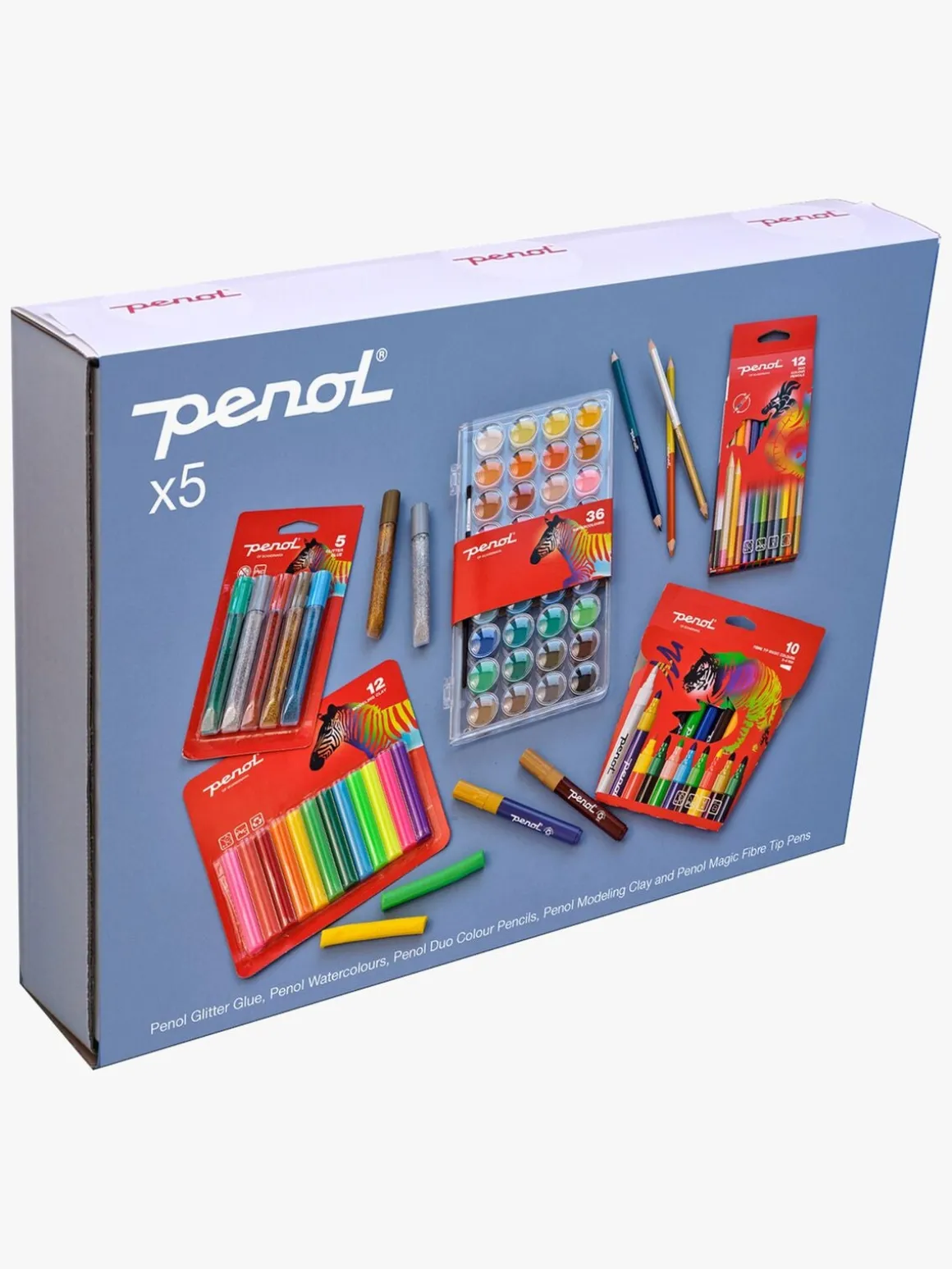 – Indeholder: 36 vandfarver, 10 fibertusser, 12 duo farveblyanter, 1 modellervokssæt i forskellige farver, 1 sæt med glitterlim i forskellige farver, 1 pensel.