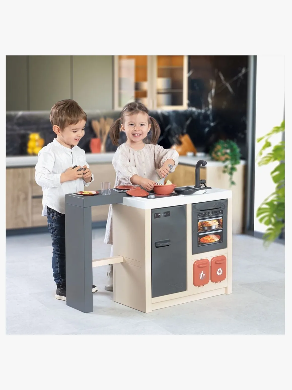 – Indeholder: 1 komfur, 1 ovn, 1 køleskab, 1 køkkenvask, 1 udtrækkelig spiseplads, 2 beholdere, 1 hylde, 23 tilbehør.