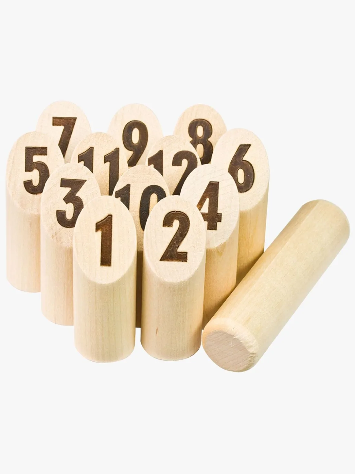 Indhold: 12 træpinde (nummereret 1-12), kastepind, spilleregler og en papkasse til at opbevare spillet i.
