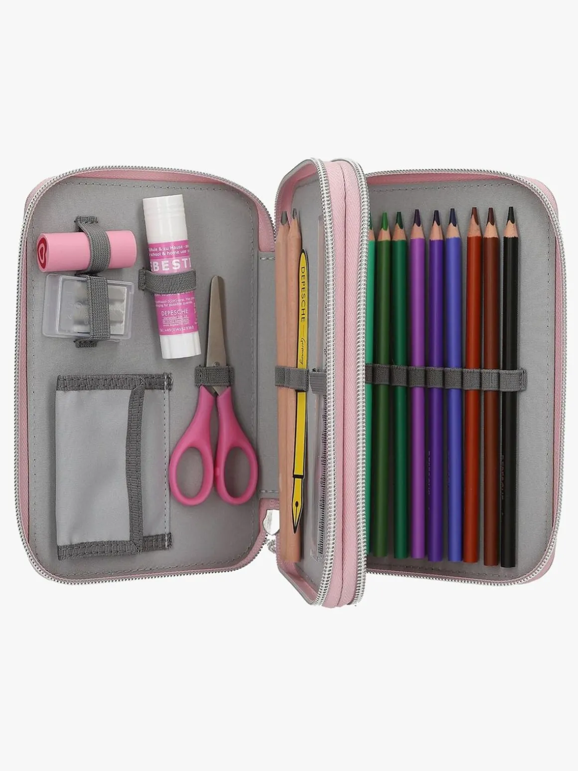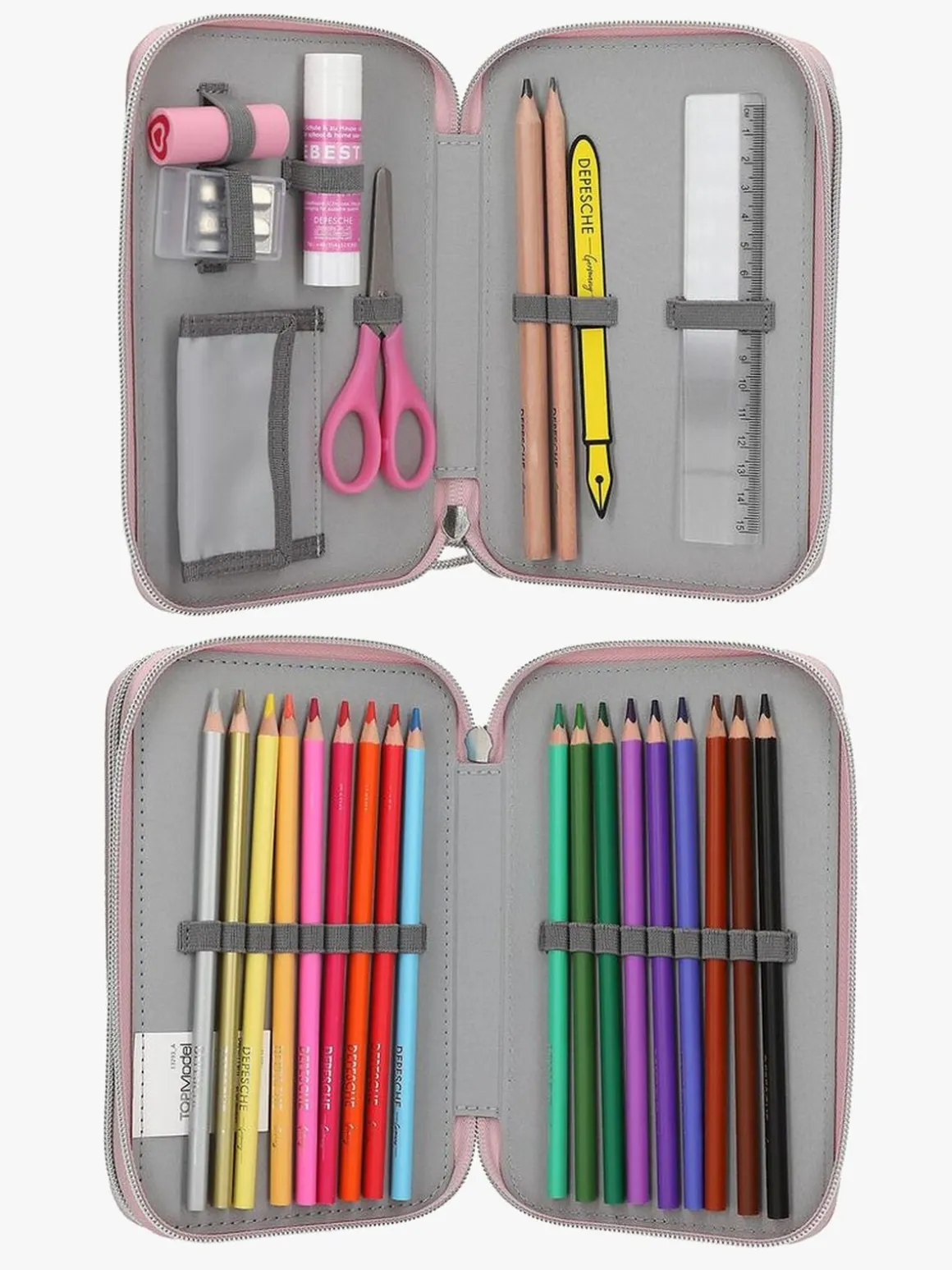 – Indeholder: 1 penalhus, 16 farveblyanter, 1 notesblok, 1 viskelæder, 1 blyantspidser, 1 lineal, 2 blyanter.
