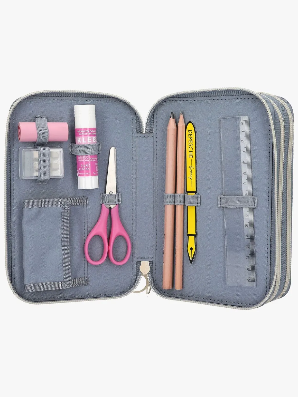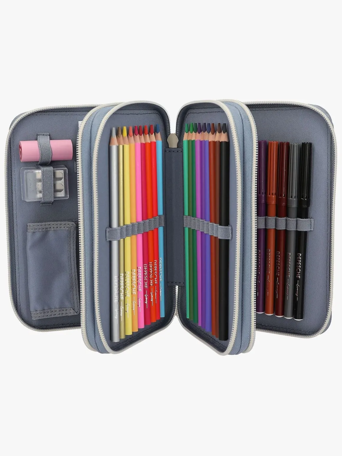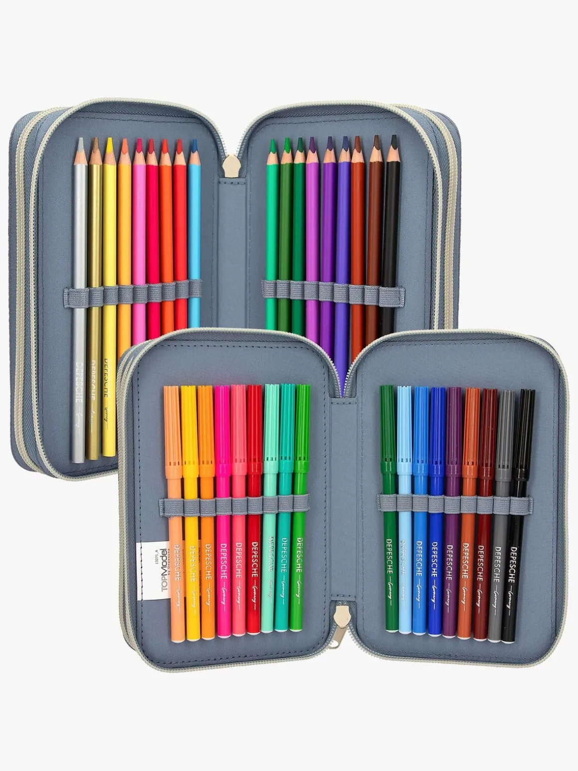 – Indeholder: 1 penalhus, 18 farveblyanter, 18 tusser, 2 blyanter, 1 saks, 1 limstift, 1 blyantspidser, 1 lineal, 1 viskelæder.