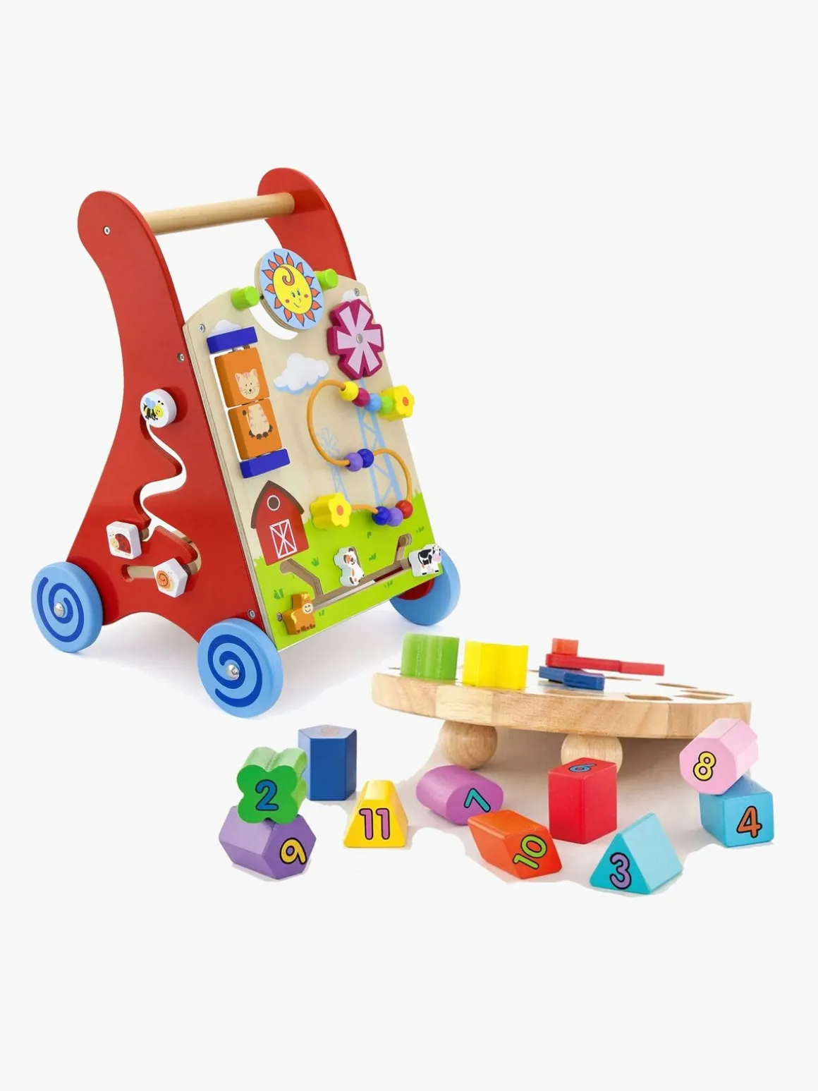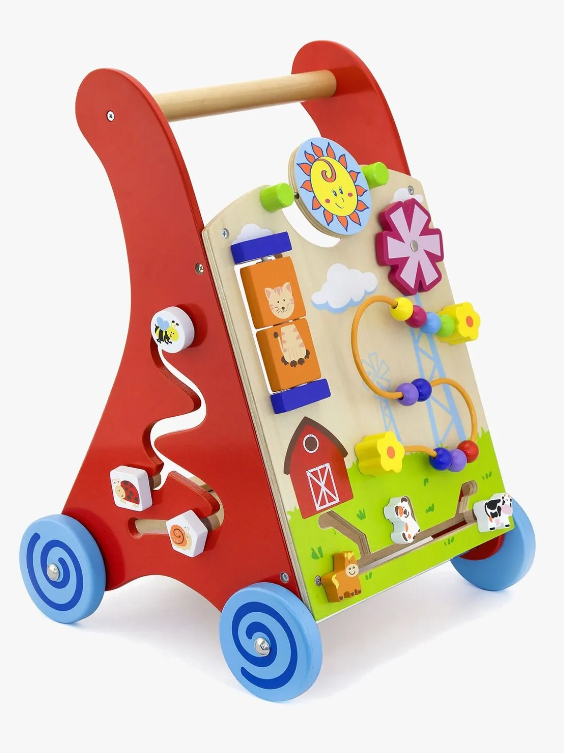 Gåvognen er sjov, stimulerende og hjælper dit barn med balancen, når det er ved at lære at gå. Gåvognen er fremstillet af træ af højeste kvalitet og håndmalet. Den har fire hjul og er dekoreret med flotte detaljer, der giver den et sjovt udseende med bondegårstema. Denne gåvogn er kombineret med skægt aktivitetslegetøj, så dit barn kan udvikle både sanser og motorik.